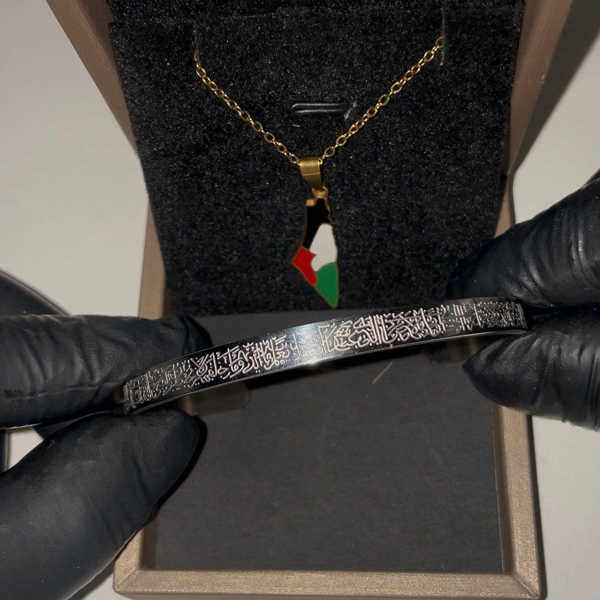 Dette eksklusive sæt kombinerer det kraftfulde Ayatul Kursi armbånd med den ikoniske Palæstina halskæde, designet til at symbolisere både styrke, beskyttelse og tilhørsforhold.